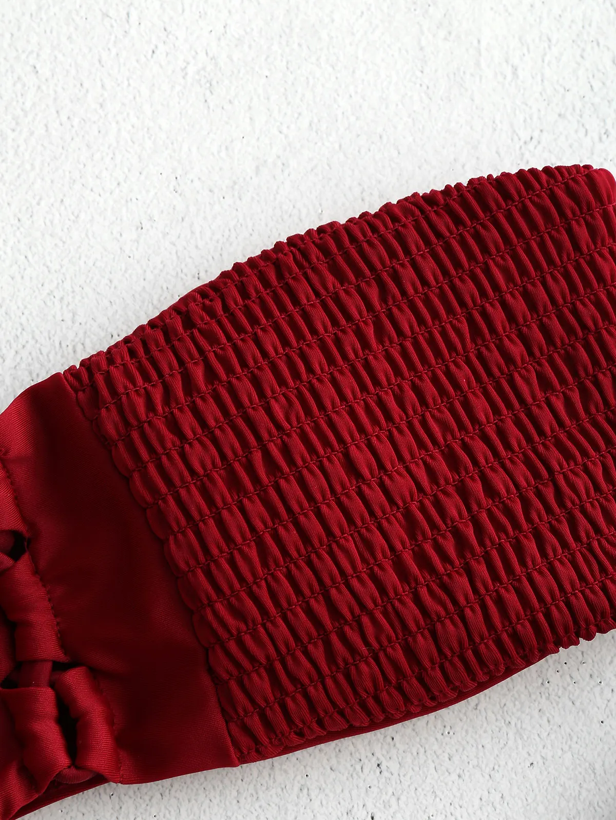 Off Shoulder Bandeau Solid Pleat Push Up Swimsuit